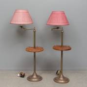 Paar gelijkende messing vloerlampen met zwenkbare lichtpunten en houten plateau halverwege de stam -stof van kappen wat verbleekt, gebruikssporen-, 130 × Ø 50 cm
