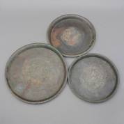 Drie ronde koperen talam offerschalen met centaal gegraveerde medaillons, Java -defecten-, Ø 38,5-49,5 cm