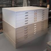 Metalen archiefkast in twee delen op plint, met tien brede lades voor papier of schilderijen -gebruikssporen-, 137 × 141 × 96 cm