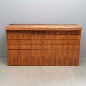 Notengefineerde multiplex ladekast, afgedekt met zwaar (losliggend) beukenhouten werkblad -werkblad scheluw en met gebruikssporen-, 95 × 175 × 55 cm