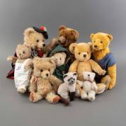 Acht mohair beren en een kat, diverse merken, waaronder: Esprit, Bruins, Karin Heller, Galvin, Naomi Laight Collectors Bear -in gebruikte staat-, grootste 45 cm