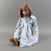 Kunststof meisjespop met blauwe jurk, de jurk gemerkt Götz, in de nek onduidelijk gemerkt: f Bjf?, circa 68 cm