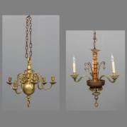 Drielichts Venetiaans kroonlampje, samengesteld, 19e eeuw -enkele chips-, hoogte inclusief ophangoog 68 cm, en vijflichts messing kaarsenkroontje met losse ijzeren ketting, hoogte inclusief ophangoog 42 cm