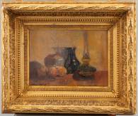 Hollandse School: stilleven met olielamp, olieverf op paneel, l.o. gesigneerd F.C. van Waalwijk, 16 × 22 cm