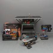 Divers gereedschap: zaagtafel, kolomboortje, elektrische figuurzaag, en enkele stuks handgereedschap