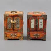 Twee Chinees houten bijouterieënkastjes met messing monturen en natuurstenen inlegwerk, 20e eeuw -één natuurstenen plaatje ontbreekt-, 22 × 16 × 12 cm