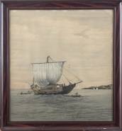Geweven voorstelling: Chinese jonk op het water, 20e eeuw, niet gesigneerd, 59 × 55 cm