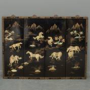 Vierdelig Chinees zwartlak wandscherm met parelmoer decor van de acht paarden van Wang Mu -lichte slijtage-, 91,5 × 122 cm