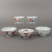 Drie diverse Chinees porseleinen Imari kommen, een Amsterdams bont kom, en een kom met blauw-wit bloemdecor, 18e eeuw -defecten-, 7 × Ø 14,5 cm