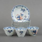 Tien Chinees porseleinen schoteltjes en drie kommetjes, alle met Imari landschapsdecor, Qianlong -defect-, Ø 12,1 cm