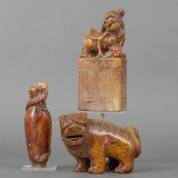 Drie Chinese spekstenen snijstukken -het vaasje met schroef in bodem en randschilfers-, hoogste 18 cm