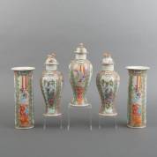 Vijfdelig Kantonees porseleinen kaststel met polychroom decor: figuren, en vogels tussen bloemen, eind 19e/begin 20e eeuw -één vaas gelijmd in buik, één vaas gelijmd bij hals, en enkele andere kleine defecten-