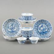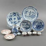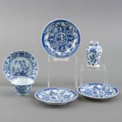 Divers Chinees porselein, bestaande uit: geschulpte kom en schotel met blauw-wit bloemdecor, 18e eeuw -randschilfers-, drie schotels met blauw-wit decor van figuren en bloemen, 19e eeuw -randschilfers, één schotel met gelijmde breuk en scherf-, en miniatuur vaasje met decor van vogels en vlinders, 19e eeuw -haarlijn-, vaasje 7,5 × Ø 5 cm