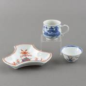 Chinees porseleinen Imari pattipan, Chinees porseleinen kopje -haarlijntje in bovenrand-, en een Japans porseleinen Imari kommetje -haarlijn-, alle 18e eeuw, pattipan 16 × 14 cm