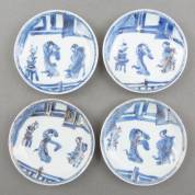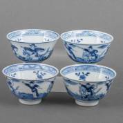 Vier Chinees soft paste kommetjes met blauw-wit decor: Joosje te paard, Kangxi gemerkt, 19e eeuw -chipjes, één met haarlijn-, 5 × Ø 8,5 cm
