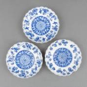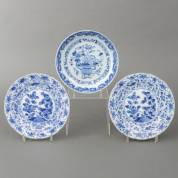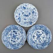 Serie van drie Chinees porseleinen gelobde bordjes met blauw-wit decor: centraal een pioenroos, daaromheen vogels en bloesemtakken, gemerkt, Kangxi -één gelijmd en mist een scherf, één met chips-, Ø 15 cm
