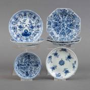 Zeven Chinees porseleinen kommetjes en zes schoteltjes met blauw-witte decors, 18e en 19e eeuw -enkele defecten-, schotel Ø 13,5 cm
