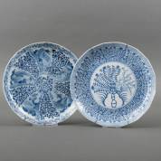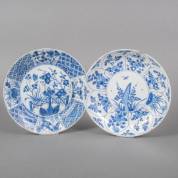 Paar Chinees porseleinen borden met gelobde rand en blauw-wit decor: centraal planten, daaromheen vissen en kreeften, gemerkt, 18e/19e eeuw -één met randchips en haarlijn in de ziel, één met randchipje-, Ø 23,5 cm, en een diep bord met blauw-wit bloemenmanddecor, eerste helft 18e eeuw -randchips, haarlijn-, Ø 22,5 cm