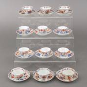 Twee series van zes Japans porseleinen Imari kommetjes en schoteltjes met florale decors, 18e en 19e eeuw -defecten-, grootste schoteltjes Ø 10,5 cm