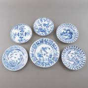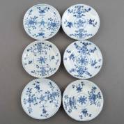 Serie van zes Chinees porseleinen schoteltjes met blauw-wit floraal decor, Qianlong -defecten, één gelijmd-, Ø 14 cm