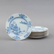 Acht Chinees porseleinen borden met blauw-wit rivierlandschapsdecor, Qianlong -enkele haarlijnen en rimfrittings-, Ø 22,5 cm