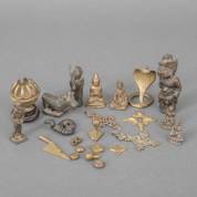 Diverse metalen beeldjes en voorwerpen, voornamelijk Azië, waaronder bronzen krisheft, hoogte 9 cm