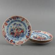 Vier Chinees porseleinen Amsterdams bont bordjes met tuindecor, 18e eeuw -randschilfers en chips, één met scherf-, Ø 16,5 cm