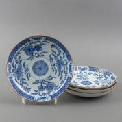 Serie van vier Chinees porseleinen diepe borden met blauw-wit floraal decor, 18e eeuw -chips, haarlijn, barst-, Ø 21,5 cm
