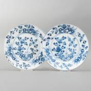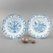 Paar Chinees porseleinen borden met blauw-wit floraal decor, 18e eeuw -één bord met randschilfers-, Ø 24,5 cm