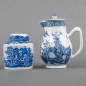 Bedekt Chinees porseleinen melkkannetje met blauw-wit landschapsdecor, Qianlong -chipjes van deksel-, 15 cm hoog, en een creamware theebus met blauw-wit transferdecor, Worcester, tweede helft 18e eeuw -deksel van later datum, enkele chipjes-, 9,5 × Ø 8 cm