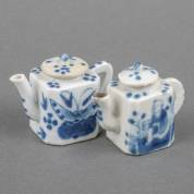 Paar vierkante Chinees porseleinen miniatuur theepotjes met blauw-wit decor: één met vlinders -deksel gerestaureerd-, de ander met zotjes -chip van deksel-, 19e eeuw, 5 × 7 × 4 cm