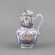 Chinees porseleinen Imari chocoladekannetje met landschapsdecor en haaks geplaatst oor, 18e eeuw -enkele randschilfers, haarlijntje chip van tuit-, hoogte 16 cm