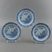 Drie Chinees porseleinen borden met waterlandschapsdecor, Qianlong -randschilfers-, Ø 23 cm