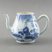 Chinees porseleinen theepot met blauw-wit decor: vrouw en zotje in tuin met kraanvogel, Yongzheng -zonder deksel, chipjes van tuit- 11,5 × 19 × 11 cm