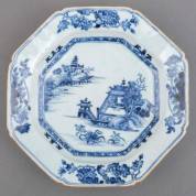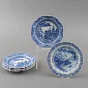Serie van vijf octagonale Chinees porseleinen schoteltjes met blauw-wit rivierlandschapsdecor, tweede helft 18e eeuw -chips, haarlijn-, Ø 15,5 cm, daarbij: gelijkend soft-paste octagonaal schoteltje met rivierlandschapsdecor, 18e eeuw -chips, twee haarlijnen-, Ø 16 cm