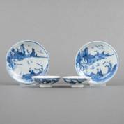 Twee Chinees porseleinen schoteltjes met blauw-wit decor: ruiter in rivierlandschap, 19e eeuw, Ø 11,5 cm, en twee Chinees porseleinen deksels met blauw-wit decor: man en vrouw op drakenboot, gemerkt, 19e eeuw -alle met randchipjes-, Ø 11,5 cm