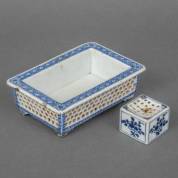 Chinees porseleinen bollenschaal -chipjes-, en een vierkante Chinees porseleinen zandstrooier -barstje-, 18e/19e eeuw, schaal 5 × 16 × 11 cm