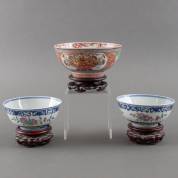 Drie Chinees porseleinen kommen: één Amsterdams bont met bloemenvaas- en landschapsdecor, 18e eeuw, 7 × Ø 15 cm; en paar met famille rose fruitdecor en blauw-witte ornamenten, met Qianlong zegelmerk, 20e eeuw -één randschilfertje-, 5,5 × Ø 12 cm, daarbij: drie houten basementjes