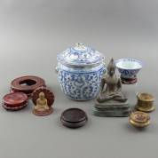 Diverse Aziatica, waaronder: Thaise bronzen Boeddha, keramiek en houten basementjes