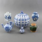 Divers Chinees porselein en aardewerk: geschulpte dekselpot, twee diverse gemberpotten, theepot, wijnwarmer en dekselpotje, 20e eeuw -gebruikssporen-, dekselpot 26 × Ø 23 cm