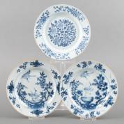 Drie Chinees porseleinen borden met blauw-witte decors: twee met kraanvogels, één met floraal decor, 18e eeuw, Ø 22 cm