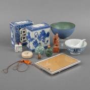 Divers Aziatica: waaronder: twee porseleinen hoofdkussentjes, kommetje met lepel, diverse snuifflesjes, en gesneden stenen stempel, daarbij: aardewerk kommetje, uitvoering Zaalberg, en verzilverd fotolijstje, dagmaat 16,8 × 11,8