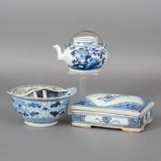 Divers Chinees porselein met blauw-wit decor, bestaande uit: rechthoekige dekseldoos, de binnenzijde met Chinese karakters, trekpotje met floraal decor, en samengestelde kom met floraal decor, 18e en 19e eeuw -tuit trekpot met chip , dekseldoos 6,5 × 16 × 11 cm