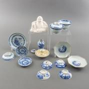 Divers Chinees en Japans porselein: diverse deksels, balustervaasje, beeld van een onsterfelijke, famille jaune dekselschaaltje, 18e-20e eeuw -wisselende conditie-, afmetingen onsterfelijke 10,5 × 14 × 10 cm