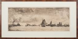 Albert Hemelman (1883-1951), gezicht op het Oostelijk Havengebied van Amsterdam, ets, r.o. gesigneerd, eerste kwart 20e eeuw, 26,5 × 69 cm