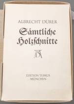 Albrecht Dürer: Sämtliche Holzschnitte (354 afbeeldingen op losse bladen). München, Ed. Tomus, 1976. In linnen cassette, 49 × 33 cm, met begeleidende tekst: M. Mende, Zum Leben, zum Holzschnittwerk, chronologisches Verzeichnis, Zeittafel, Konkordanz. 64 pp. -cassette stoffig-