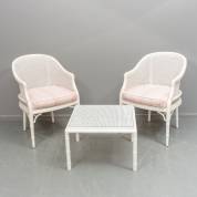 Paar witgelakte faux bamboe kuipstoelen met rotan bespanning, en bijbehorend bijzettafeltje, tafeltje 41 × 61 × 61 cm