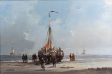 Cor Corsius (1928-1997), strandgezicht met bomschuit en vissers, olieverf op doek, r.o. gesigneerd onder pseudoniem Mooyman, 60 × 90 cm