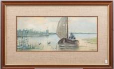 Aquarel: boer in bootje, naar Hamel, r.o. gesigneerd J. Moser Cz, 19 × 44 cm