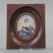 Ovaal miniatuurportret: vrouw in blauwe jurk, aquarel, in houten lijstje, begin 20e eeuw, 15 × 12,5 cm